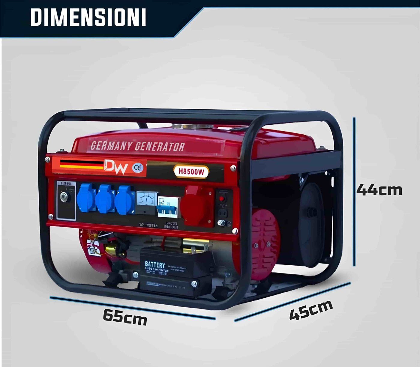 Le dimensioni del generatore sono 65 cm di larghezza, 44 cm di altezza e 45 cm di profondità. 40kg